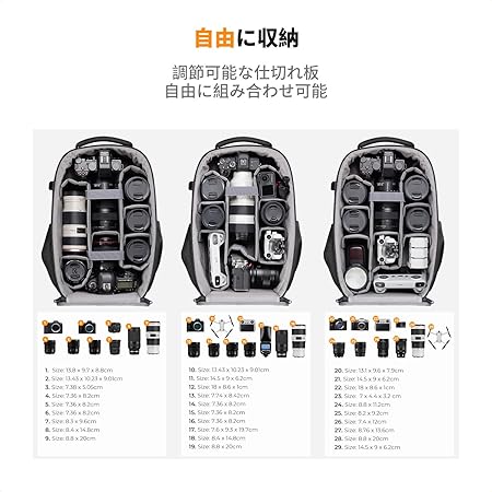 - 大きな機材や長尺の望遠レンズなどを入れる際に、仕切りを調整してスペースを最大限に活用しやすいです。