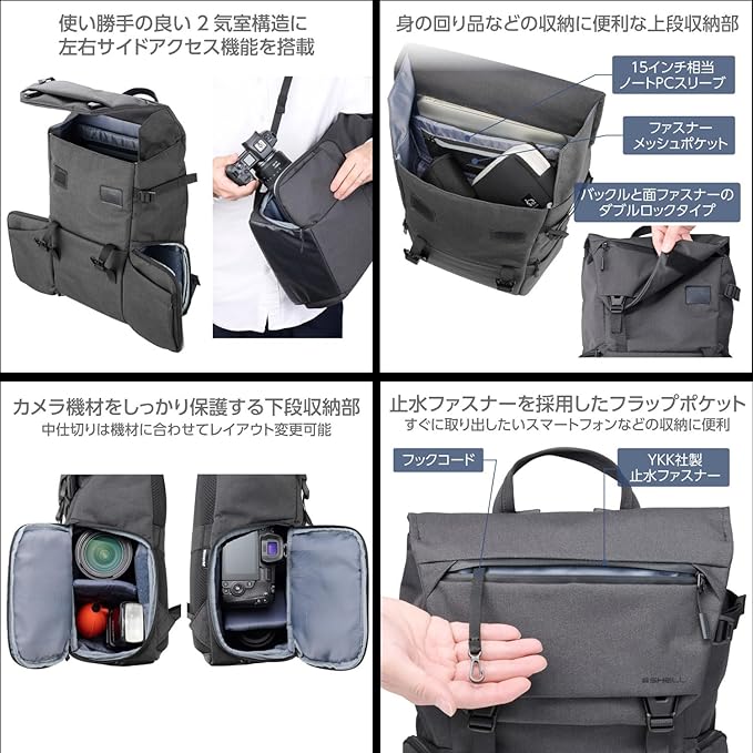 カメラ機材のほか、アクセサリーや手持ち品を入れるスペースがあるので、使い勝手が良いです。