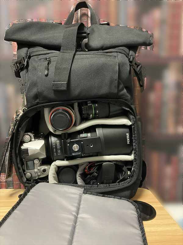 このタイプは機材がメインとなるため、超望遠レンズを装着した状態でもしっかり収納できますね。